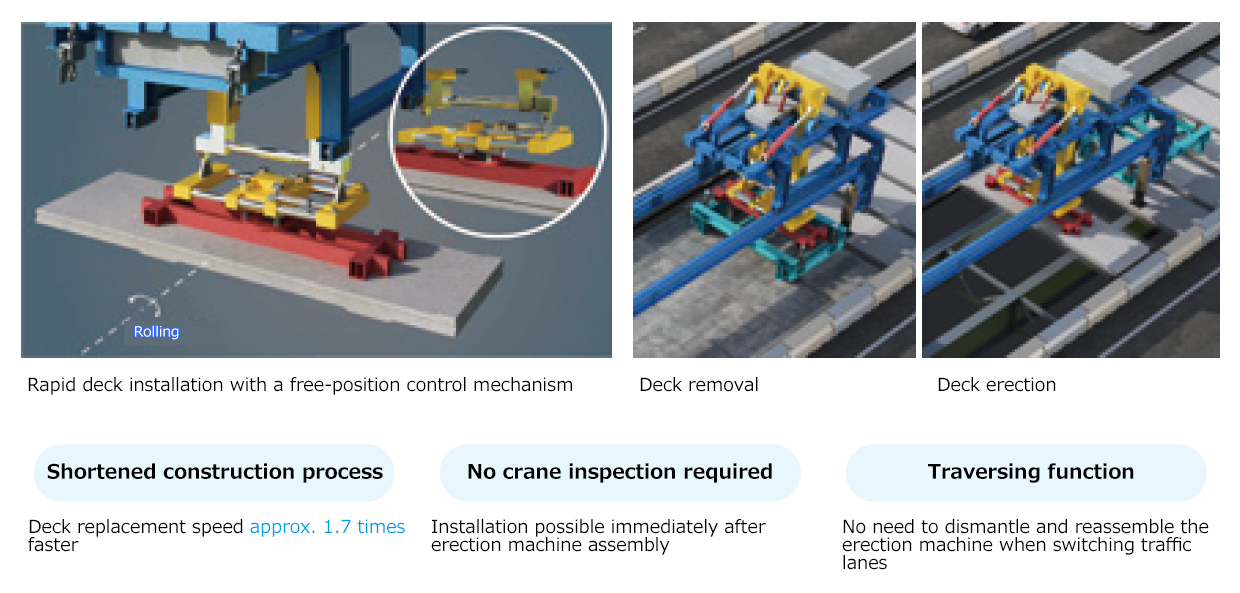 The Grabbing Erector Method is a deck replacement technique that performs both the removal of deteriorated decks and the erection of new decks with a single device. 入金 不要 ボーナス スポーツ ベット enables half-section construction, allowing for deck replacement in widthwise divisions while maintaining the existing number of expressway lanes. With its gripping mechanism capable of controlling deck positioning in three dimensions, the replacement speed is approximately 1.7 times faster than conventional methods. Additional features include exemption from crane inspections, since the gripping mechanism is not classified as a crane, and a traversing function that eliminates the need to remove the equipment when switching lanes.