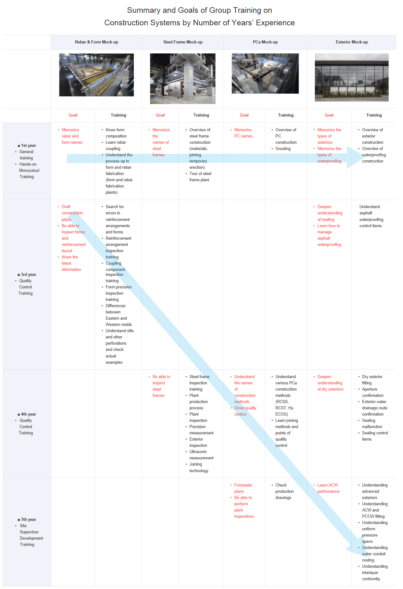 The opening of the スポーツベット 特典 Training Center has added training at the center to the existing classroom learning and OJT that formed the two wheels of existing training. This has linked the two and enabled Shimizu to anticipate greater practical benefits.Systematic practical training is possible through programs established according to the number of years of experience. For example, there is a “Hands-on スポーツベット 特典 Training” program for 1st-year employees, a thorough “Quality Control Training” program for 3rd- and 4th-year employees on architectural construction, and a “Site Supervisor Development Training” program for 7th-year employees.Providing training that will give a broad education and develop pride and motivation, not only among engineers, but among all employees of Shimizu as people who are involved in the construction industry is a unique characteristic of the training at the スポーツベット 特典 Training Center.
