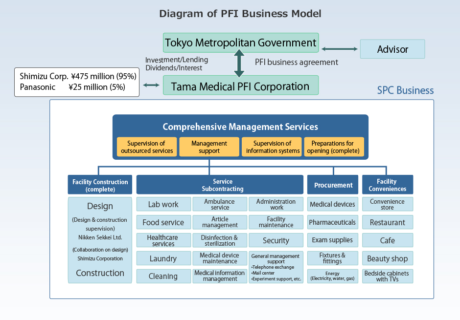 The システムベット スポーツ is operated according to the new PFI*1 business model. The Tokyo Metropolitan Government handles parts that are directly related to healthcare, and nearly all other facility maintenance and management, security, reception, meal service, inspections, and other services involved in システムベット スポーツ operation are handled by a special purpose company*2 (SPC) set up by Shimizu. Shimizu's participation involves the assignment of 10 employees from Shimizu to Japan's largest PFI-run システムベット スポーツ business, together with 1,300 staff members from 40 partner companies.