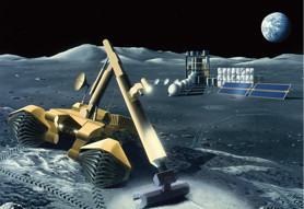 Robots will play the lead role in lunar surface construction. Remote control from earth will enable 24-hour operation.