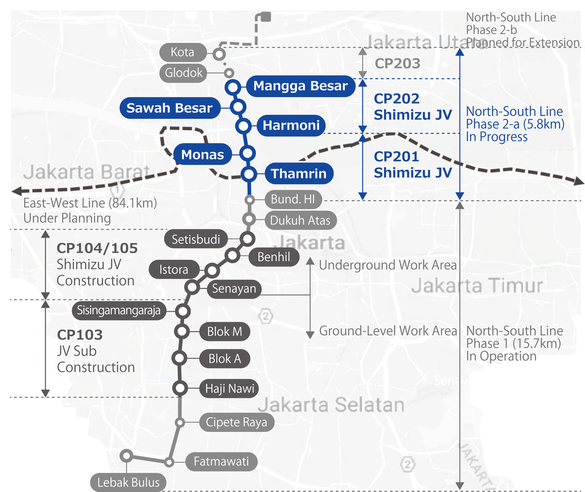 Indonesia, an island nation made up of over 17,000 islands, is facing worsening traffic congestion and air pollution in its capital, Jakarta, due to rapid economic growth. The Jakarta Mass Rapid Transit (MRT) North-South Line, spanning 24 km, was planned to address these issues. Phase 1 (L=16 km) contract package completed in March 2019, involved our company for three civil work contract packages out of five in total. スポーツベット ブラックジャック is underway on Phase 2A, extending the line 5.8 km northward from the operational segment. Our JV is responsible for two of the three contract packages : CP201 and CP202.