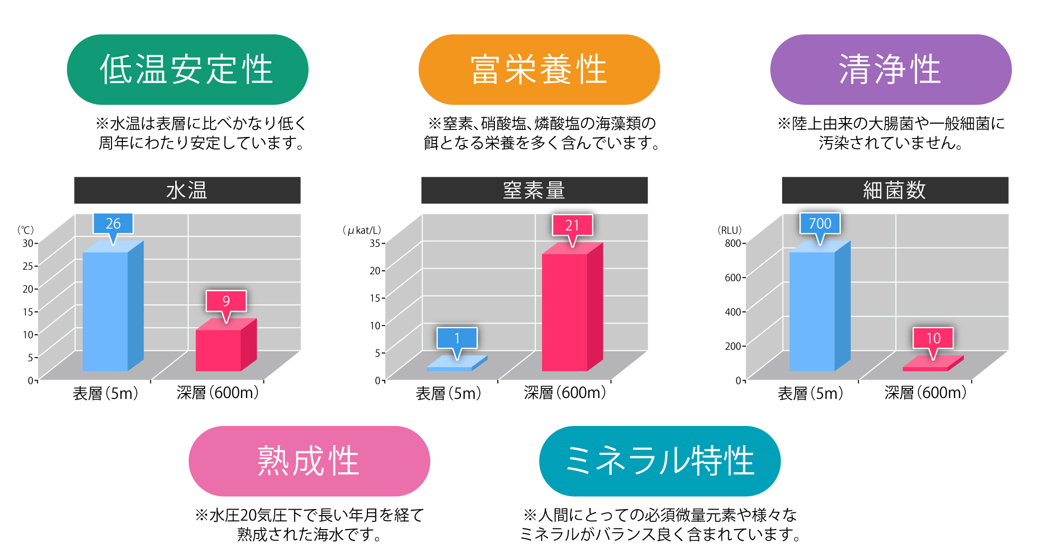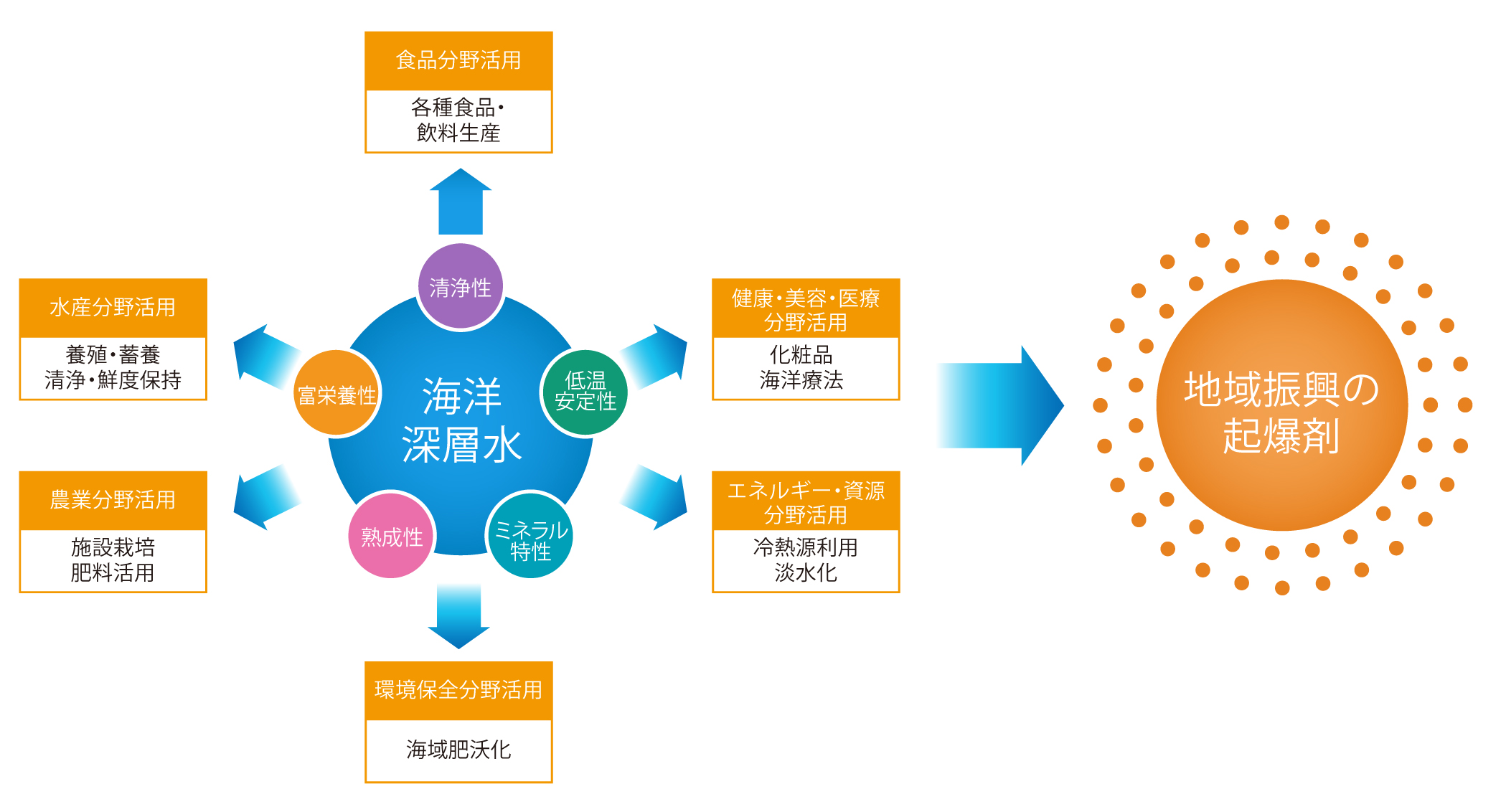 養殖等の水産分野や野菜栽培等の農業分野、清涼飲料水等の食品分野、タラソテラピー等の健康・美容・医療分野等広い利用事例があり、更なる利用可能性が期待されます。