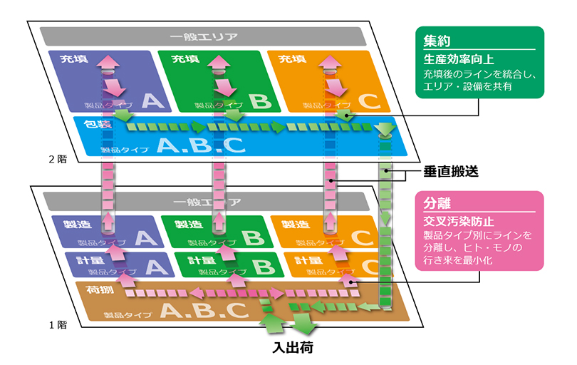 新工場のコンセプトである “多品種少量生産”は、工場内で多種多様な原料、中間品、および製品を取り扱うため、交叉汚染への対策が必要不可欠となります。そのため、新工場では原料計量から製造まで一貫した製品タイプ別分離型レイアウトを採用し、品種間でのヒトおよびモノの行き来を最小化しました。同時に、充填後の包装工程については各ラインを統合する、などの生産効率化にも考慮しました。