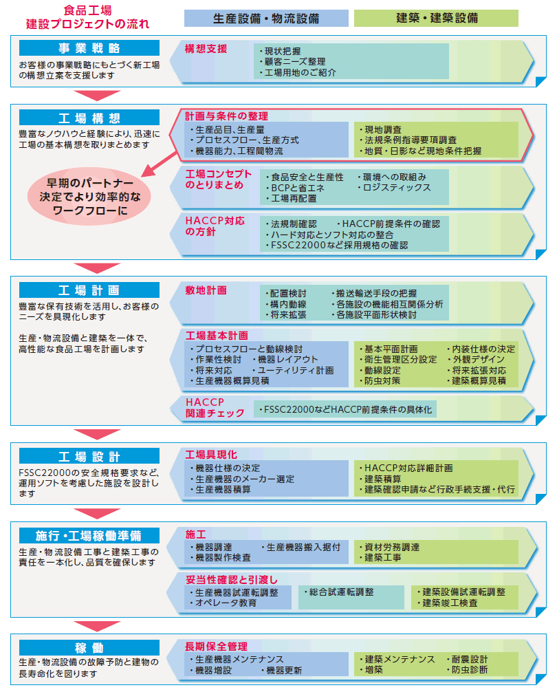 スポーツベット 野球ズのトータルエンジニアリングでは、生産設備と建築を別々でなく一体で捉えた最適化で、製品安全担保など施設の目的とする機能を実現します。 構想段階でお客様のニーズを把握し、与条件を整理、施設コンセプトを明確化。そして基本計画を立案し、高度な要求にも対応できる製造プロセスを具現化するための仕様決定を行います。 スポーツベット 野球ズはこれまでの実績で培った経験を活かし構想の段階から設計、施工、維持管理まで一貫して取り組むことでお客様が施設に期待される機能を具体化します。