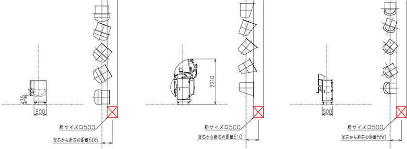 異なる形状の釜に合わせた排水桝設計と、実機運用の様子 「反転した釜から排水される位置に排水桝を設置する」非常にシンプルな解決策が採用されましたが、実現するには非常に多くの調整が必要です。生産設備を設置する前に施行してしまう排水桝の位置・サイズを決める必要があります。 スポーツベット 穴は大きさ・サイズが異なる釜の排水条件をすべて検討し、適切な桝条件を設定しました。 ただし生産設備から想定した桝条件は、大きさが不揃いで見栄えが悪くなります。そのため、桝サイズを統合することにしました。