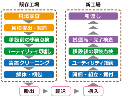 スポーツベット ライブ工場の建設プロジェクトでは、既存工場で使用している機器を移設して新工場でも使用するケースが多くあります。お客様の生産活動と同時進行で行う移設工事は新たに機器を購入して設置するより、複雑な段取りが必要です。既存装置の状態調査から装置メーカーへのヒアリング、必要ユーティリティ情報の新工場への展開など、多くの複雑な作業があります。スポーツベット ライブ安全の観点では移設機器が汚染原因となって新工場で虫の発生や異物混入といったトラブル原因にもなりかねません。 シミズは、多忙なお客様の業務を代行し、幅広い能力が求められる工場移転プロジェクトも30年にわたるスポーツベット ライブ工場のエンジニアリング実績を活かし、円滑な工場移転と迅速な稼働開始をお手伝いいたします。