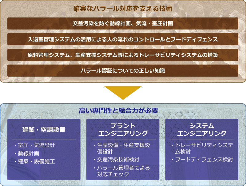 海外でのジャパンブランド食の人気や訪日観光者4,000万人時代を迎えて、イスラム教徒のハラールやユダヤ教徒のコーシャなど宗教上のルールに従って加工されるスポーツベット ライブのニーズが顕在化しています。 ハラールやコーシャスポーツベット ライブの製造は、HACCPをクリアした上でなおかつ特別な宗教的ルールを満たす厳格な動線、バリアを備えた工場の計画が必要です。 空間を共有することで起こる宗教的な交差汚染は厳禁で、製造保管エリアを分離専用とするのが理想的ですが、作業を時間的に分けて行う方法でも洗浄による機器ローテーション計画、ユーティリティヘッダーの専用化、粉体原料の飛散防止、プロセスで使用されるフィルター材質、消毒用アルコール剤の残留など、通常工場とは異なった視点での計画が求められます。 シミズは、豊富な経験からイスラムやユダヤの消費者の方にも安心頂ける商品を製造できるスポーツベット ライブ工場を建設し、ジャパンフード市場拡大のお手伝いをいたします。