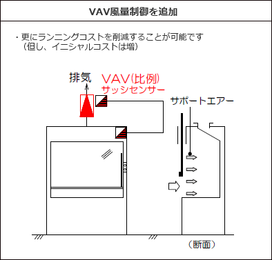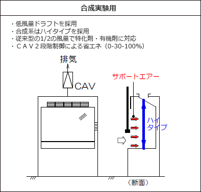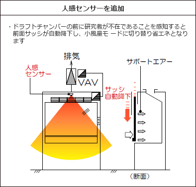 低風量タイプの局所排気設備の採用や、夜間モード等の省エネ運転計画をを積極的に行い、エネルギー負荷を低減します