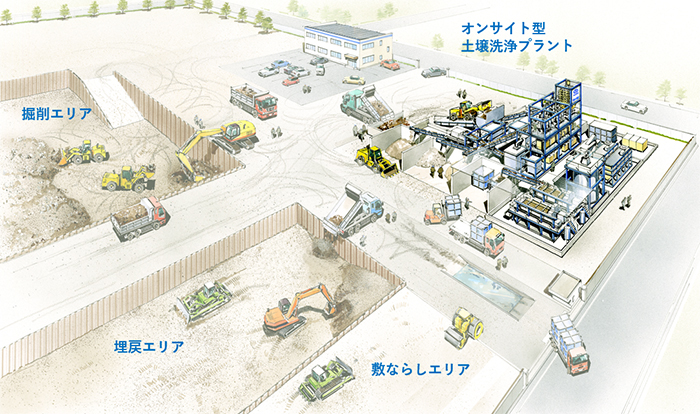 汚染土量が多い汚染サイトには、汚染サイトの条件(汚染状況、土質条件、敷地条件等)に最適なオンサイト型土壌洗浄プラントを構築し、「安全」「確実」「短工期」「ローコスト」で浄化する方策が適しています。