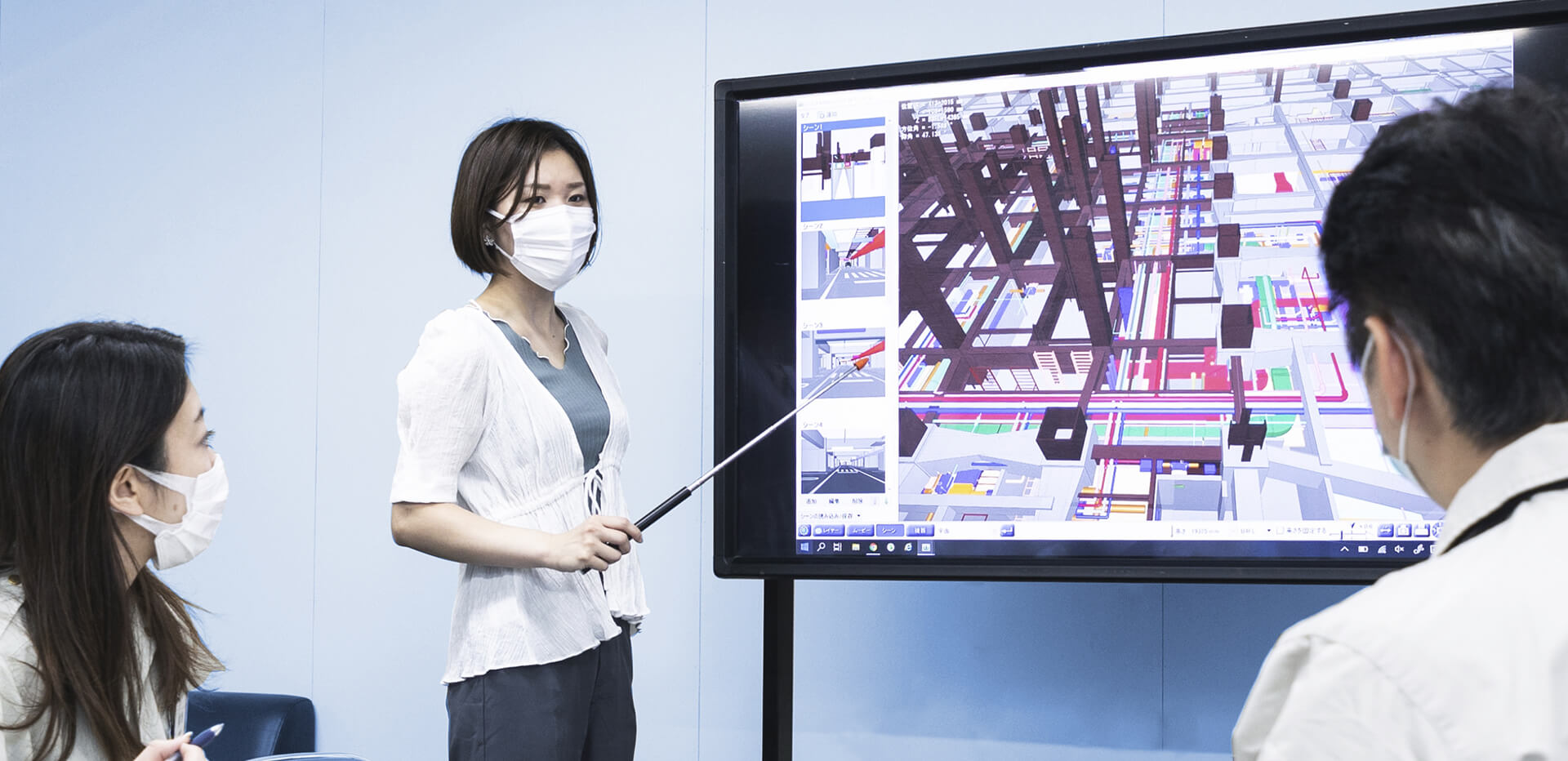 まさに今、設計変更に伴う設備の納まりを確認するため、電気・空調・衛生の各協力会社のリーダーが集まり、画面に映されたBIMを見ながら話し合いを行われている。「天井を上げたい」「形状をもっと改良したい」といった設計者の要望を反映したBIMを使って協議する。中心となるのは工務担当の粟野だ。粟野はBIMエンジニアではないが、その場で簡単に操作しながら検討を深められる。