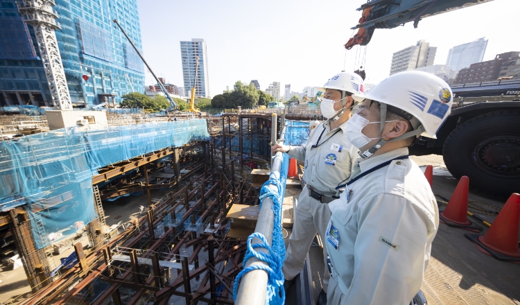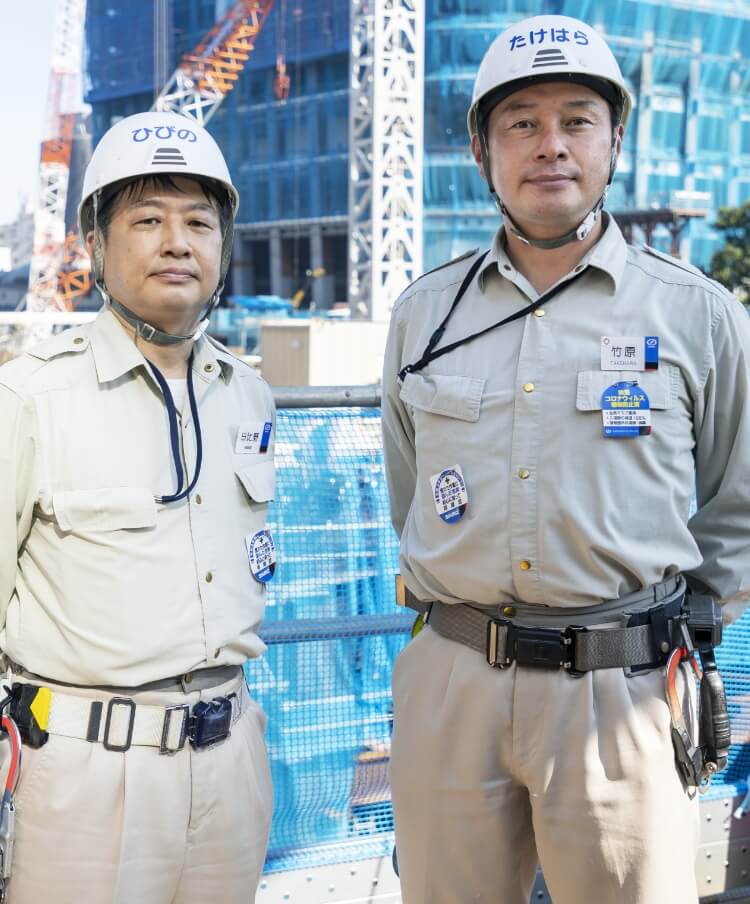 「他の支店からも人材面で多くの支援を得ていますが、適正が十分把握出来ない中で、役割分担を決定せざるを得ない状況です。業務を進めるうちに、適正が把握出来た場合は思い切って配置転換を行い、常に最適な組織づくりを心掛けています。これは比較的工期の短い建築工事では稀なこと」と竹原。「これだけの規模の現場になると施工管理者数も桁違いに多くなる。日々予定や状況が変わっていく中でコミュニケーションを取ることは非常に難しく、気を使っている部分です」と日比野。