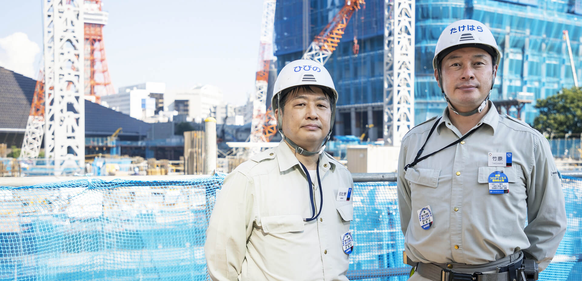 虎ノ門・麻布台プロジェクトでシミズが建設を担当している2棟のタワー。高さ約330mのA街区のタワーと、高さ約240mのB-2街区のタワーである。隣り合わせで2つの街区で副所長を務めるのが、竹原と日比野の2人だ。彼らはそれぞれの工事の難しさを次のように語る。
