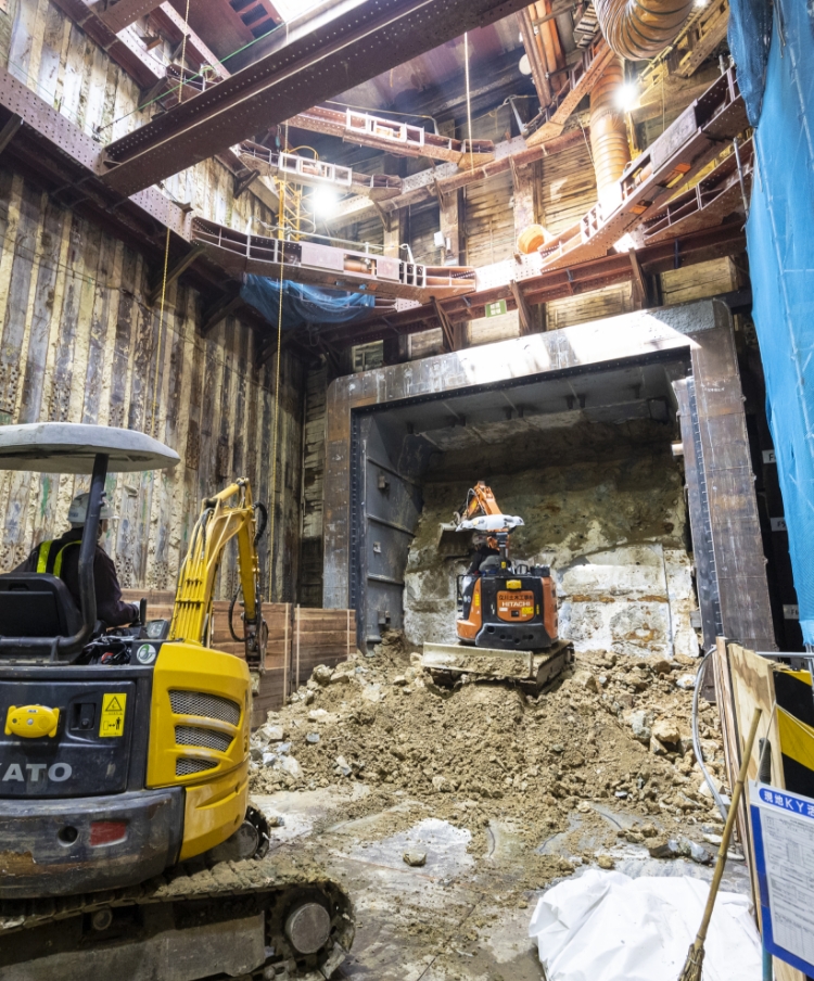 中原:URT工法では、初めにトンネルの外周部に沿って通路の壁となる約1m四方の鋼製エレメント(ボックス)を地中に10~30㎝ずつ圧入し、都度、作業員がエレメントに入り手作業で地山を掘削していきます。最終的にはエレメント内部にコンクリートを打設して壁を構築した後、通路内部を掘削します。大がかりな開削が不要なので、地中埋設物を損傷する可能性が極めて低い工法といえます。