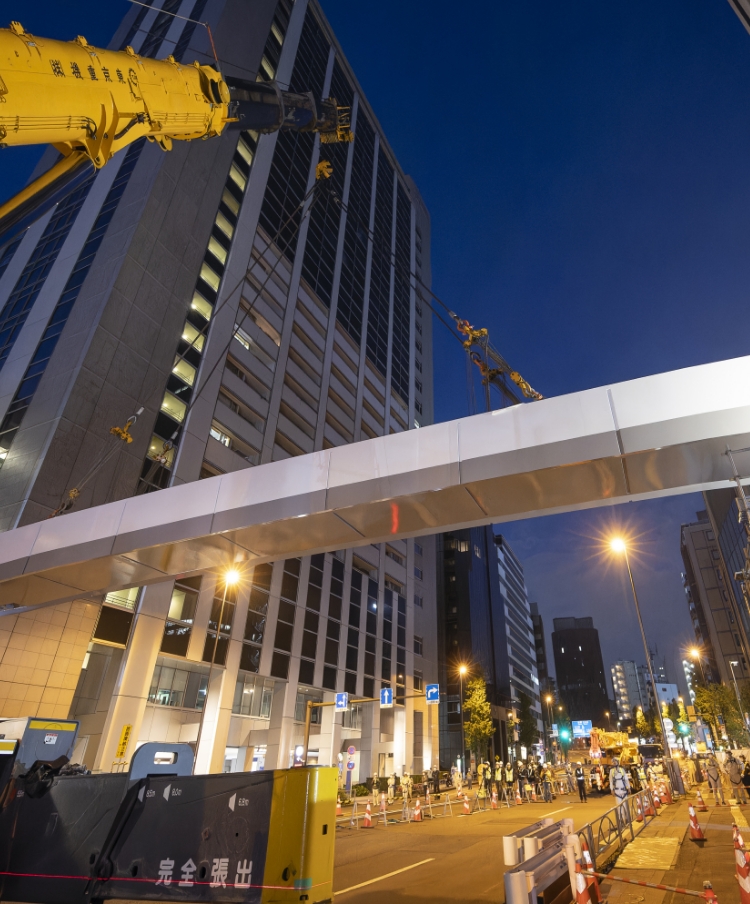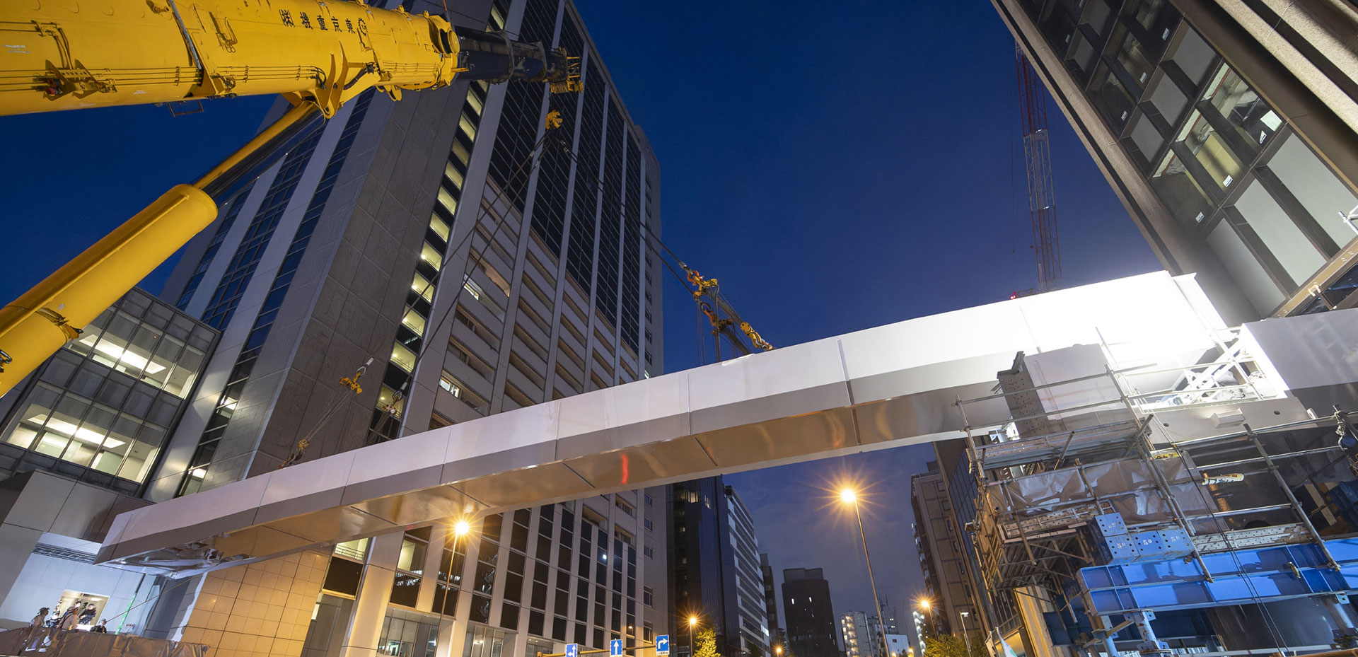 佐々木:はい。工場で仮組み検査した後、輸送可能なサイズに三分割して夜間に搬入しました。再開発区域内で1つにつなげてから接続部を鋼材で覆い、塗装仕上げを施しました。また、工事の音をできる限り抑えられるようにしました。工具はハンマーではなく油圧式の音の小さなものを使いましたし、古い歩道橋を撤去したときもアスファルトを剥がすのに、音の大きなブレーカーではなく、穴を開けて広げるスプレッダーという機械を使用しました。