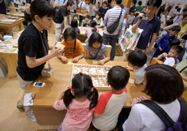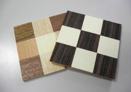 小学校低学年を主な対象に実施したワークショップでは、コースター作りを行いました。9cm角のベニヤに3cm角の単板を9枚貼るだけで市松模様のコースターが出来るとあって、当日は行列が絶えないほどの賑わいとなりました。