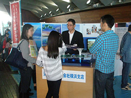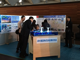 展示コーナーには当社ブースを設け、ドリームプロジェクト・グリーンフロートや、当社横浜支店にゆかりのある建物を紹介しました。グリーンフロートについては模型とパネルで内容を紹介し、担当者の説明を聞いた子どもたちを中心にグリーンフロートの缶バッジをプレゼント。用意した400個がすべてなくなる人気ぶりでした。また横浜支店にゆかりのある建物を紹介するパネル展示を前に、「この建物もスポーツベットが建設したのですね」と認識を新たにされるお客さまも数多くいらっしゃいました