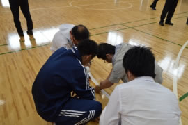 講演会に続き、シーズアスリート事務局・竹内由美氏によるゴールボールについての解説を経て、参加者3人が1チームとなってスポーツ ベット テニス会が行われました。
