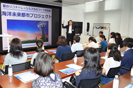 高校生と、その保護者を対象としたイベントを本社で開催しました。 前半は当社の環境未来都市構想GREEN FLOATと海洋未来都市構想OCEAN SPIRALに関する説明を受け、それぞれの模型を見学しました。後半は、2班に分かれ3Dプリンタの当社活用事例についての説明を受け模型室見学や、特殊なメガネをかけて3D立体視を体験し、最先端の設計技術に触れました。 先輩の話コーナーでは、現在の仕事についての紹介や、設計者になろうと思ったきっかけについて話がありました。 その後、模型見学や3D立体視で体験した京橋こども園の外観を見学しました。 参加者からは、「イベントに参加してみて建築自体にも興味を持ちました。」「海洋未来都市プロジェクトが想像していたよりも具体化されていて驚いた。意匠設計に興味をもった。」等の感想が寄せられました。
