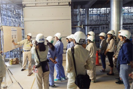 中学生から大学生までの女子生徒を対象とした見学会を土浦駅前再開発の現場で開催しました。 冒頭、建設業における女性活躍推進の取組みについて説明があり、女性が働きやすい職場環境に建設現場が変わりつつあるという話を真剣に聞き、その後、若手技術者に引率され現場見学を行いました。現場見学では、高所作業車試乗や、配筋、測量、左官等を体験し当社開発の空調服試着等熱中症対策への取り組みについても学びました。 女性技術者への質問コーナーでは、入社の動機や育児と仕事の両立、休日の取得状況などについて参加者から質問があり、回答しました。 参加者からは、「現場での仕事がよくわかっていなかったが、今回体験することができ、選択の幅が広がった。」「現場で働いている女性の声を聞けて、将来の参考になった。」等の感想が寄せられました。