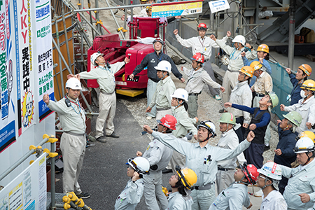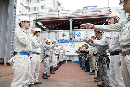 (2)朝礼の締めは、服装・体調のチェックです。「安全帯よーし!」など、元気に声を出しながら互いに指差し確認をします。