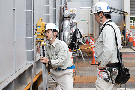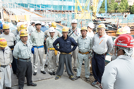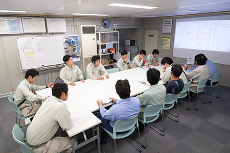 (3)協力会社ごとに集まり、当日の作業内容の確認をします。作業するうえで注意するポイントなどを話し合い、それぞれの持ち場に移ります。