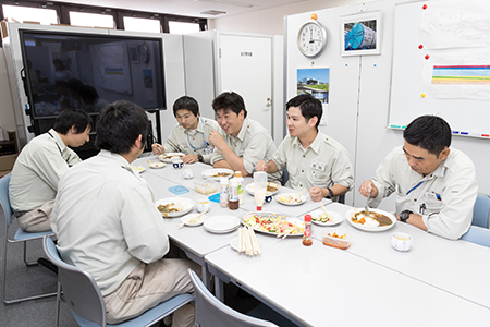 (7)社員と談笑しながら昼食です。なごやかな雰囲気の中、会話も弾みます。