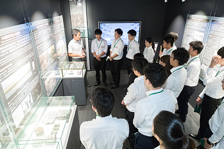 (1)技術研究所のスポーツ ベット カジノ技術歴史展示室の見学。レンガ・コンクリート・木・鉄骨などの建物構造ごとに、それらを使用した建造物の歴史について学んでもらいました。