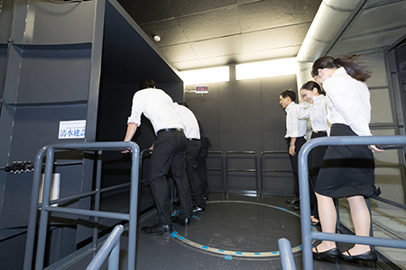 (2)風洞実験棟内の試験装置で、風の強さを体感。風速30mはかなり強いようです。