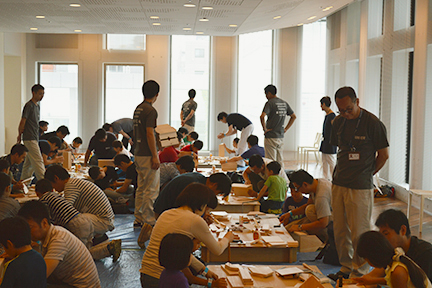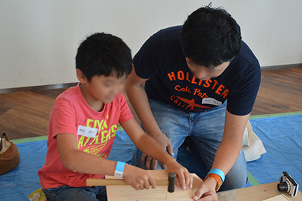 当日は、午前の部(低学年)に20組、午後の部(高学年)に15組の家族が参加。午前の部ではハウス型の木箱を、午後の部では引き出し付き本棚を製作しました。
