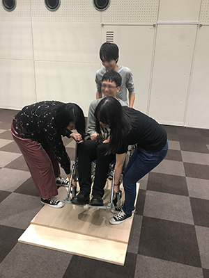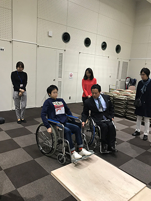 講師には、初瀬勇輔氏(2008年北京パラリンピック視覚障害者柔道90㎏級日本代表、一般社団法人日本パラリンピアンズ協会 理事)と宇城元氏(2012年ロンドンパラリンピックパワーリフティング男子75㎏級日本代表)を招き、障がい者スポーツ大会の現場の実情やボランティアに求められる知識などを学ぶ基礎講座と、視覚障がい者の誘導方法や車椅子利用者の介助方法を実習する体験型講座を行いました。体験型講座では、障がいのある方の気持ちを理解するために、アイマスクをして誘導されたり、車椅子に座って介助される体験をしました。