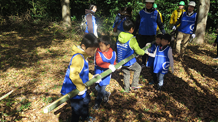 当公園の管理事業を行っている(公財)埼玉県生態系保護協会の方々の指導の下、今年度は雑木林に侵入した竹林(モウソウチク)の間伐作業を中心に公園整備を行いました。斜面林に太陽の光が差し込むようにし、雑木林の植生を回復させていくことがねらいです。