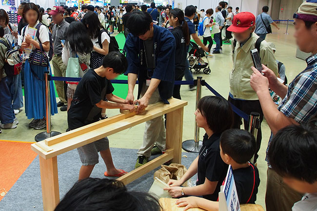10名程度の製作スペースを設置し、間伐材を利用した木製のオリジナル小物スタンドを作る木工教室を実施しました。木づちを使っての釘打ちや、やすり掛けなど、実際の大工さんのしごとを想像しながらできる木工体験が人気となり、2日間で561名にご参加いただきました。また、小物スタンドに11種類のスタンプを自由に押せることも参加者に好評で、世代を問わず多くの方々がものづくりを体験されました。