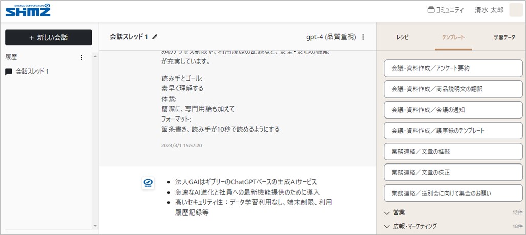 導入した法人GAIは、ギブリー(社長:井手高志)が提供するChatGPTをベースとした企業向けの生成AIサービスであり、国内で早期から展開していたサービスです。スポーツベット 特典の生成AIの導入に際しては、自社環境に独自に構築する方法とサービス導入の方法がありますが、急速に変化する生成AIの進化を見極めつつ、スピーディに最新機能を従業員に展開するために本サービスの導入を選択しました。本サービスはセキュリティ的に優れており、当社が最も懸念していた、入力したデータが学習に利用されないことはもちろん、会社支給の端末からのみのアクセス制限や、利用履歴の記録など、安全・安心の機能が充実しています。
