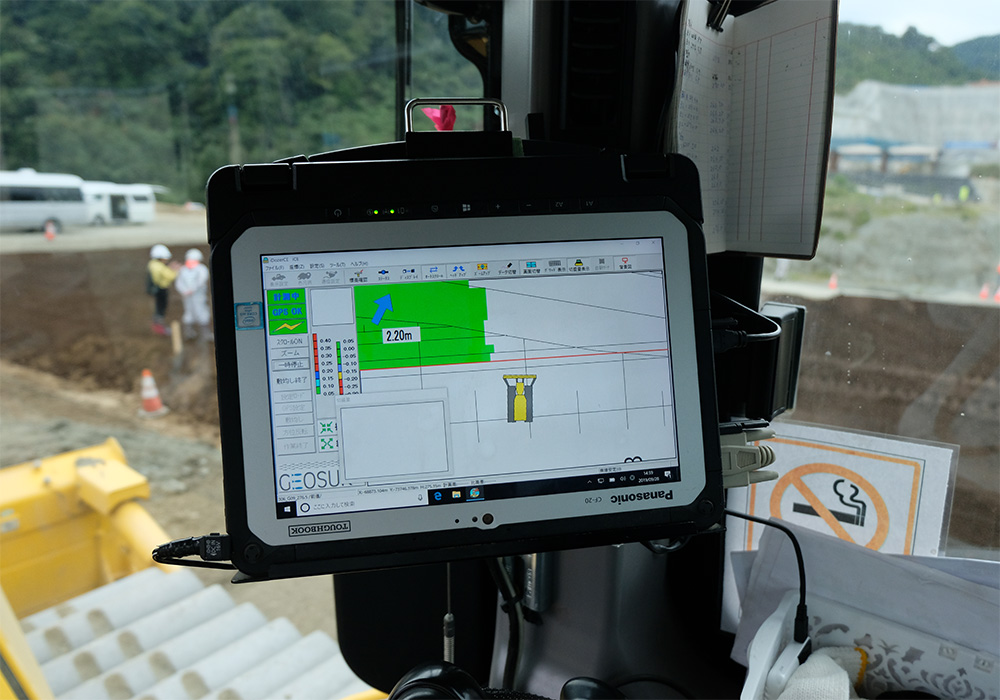 重機操作の経験が浅い方でも、正確に素早く作業できるのがICTを活用した重機です。たとえばローラマシンであれば、重機内のタブレット画面に踏み固めた部分の色が変わって表示されます。そのため、どこをどれだけ踏み固めたかが塗り絵のように一目瞭然でわかります。他にもブルドーザーならあとどれだけ土を盛ればいいかが分かったり、ショベルカーであればどこまで掘り進めればいいかが分かるようになっています。