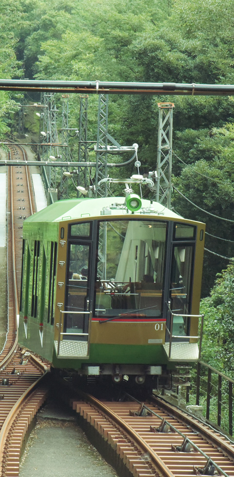 グリーンの車体がかわいいケーブルカー。麓の駅からstake スポーツベット寺駅と阿夫利神社駅を結びます。