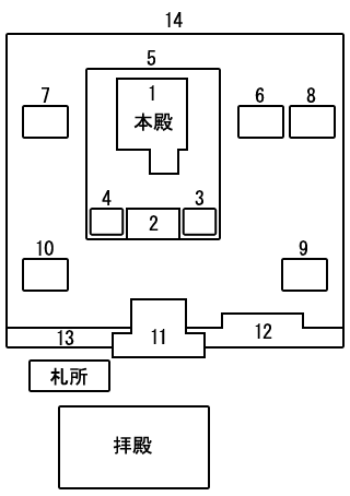- 本殿、楼門、神饌所(東・西)、大神大后神社など14棟