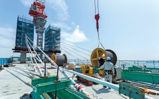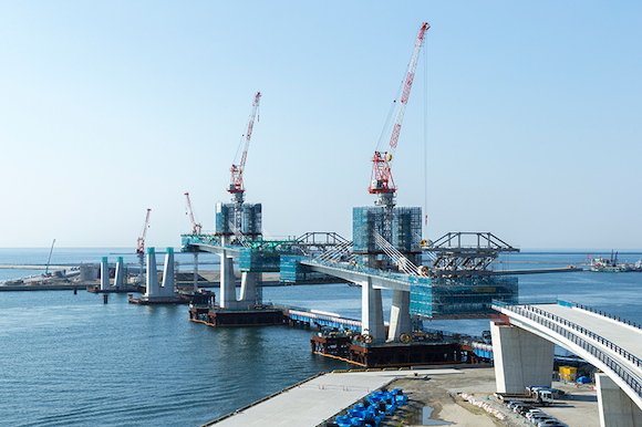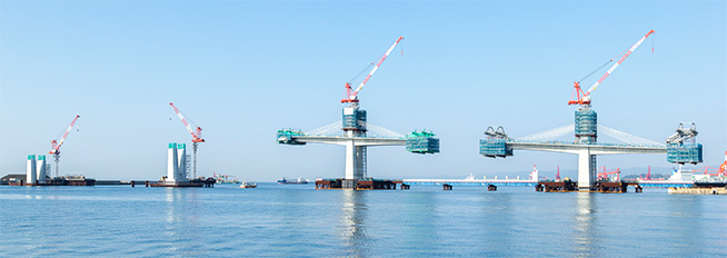- 同事業で整備されるシステムベット スポーツ(延長1805m)のうち、3号ふ頭と国際物流ターミナル(人工島)を結ぶ橋長510mの5径間連続PCエクストラドーズド橋※1の建設を当社JVが手掛けています。