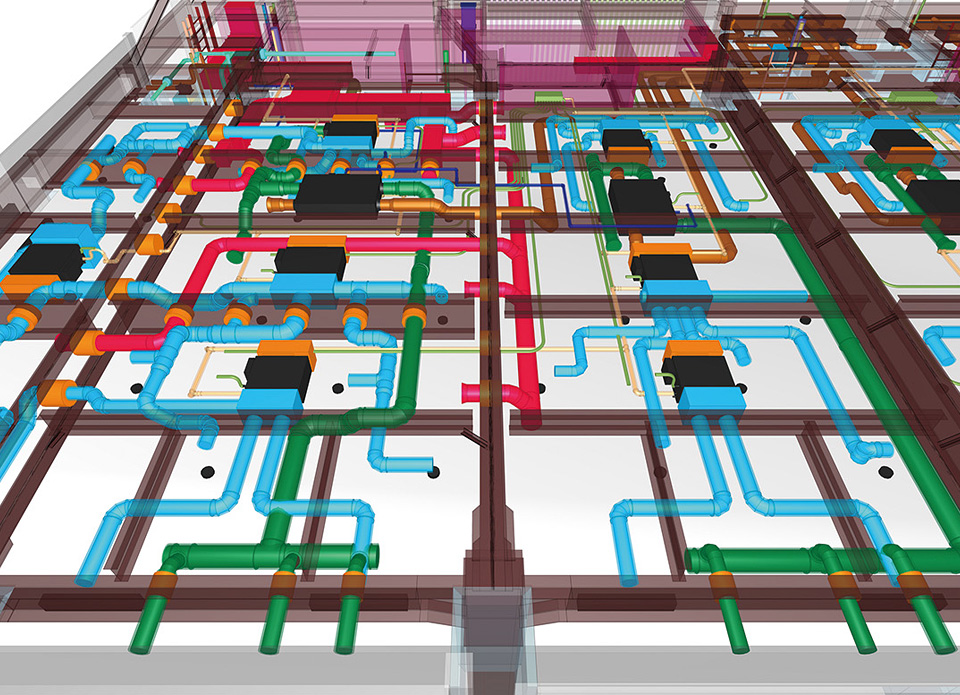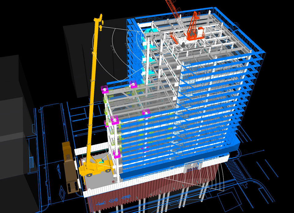 コンピュータ上で3次元の建物モデルを作成し、どんな建物をどう建てていくかを検討するためのシステムです。形だけでなく柱やドアなど材料の情報も入っていて、建物のできあがりイメージや建設途中の様子などを画面で確認することができます。図面では分かりづらい部分も画面を見ながら打ち合わせができ、建物を安全・確実に建てることに役立ちます。