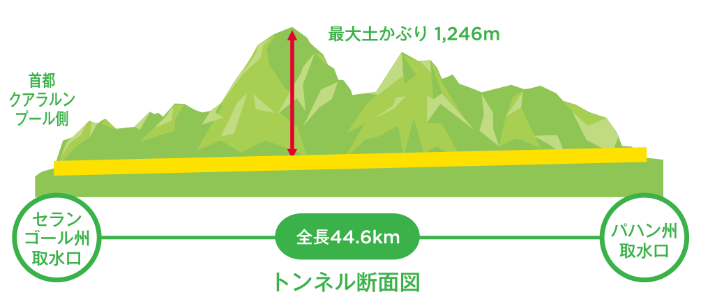 発展が著しいマレーシアの首都圏に生活・工業用水を送るためにつくられた導水トンネル(水を流すためのトンネル)です。全長44.6kmは東南アジアで最長で、1日に約189m3の水が供給されます。