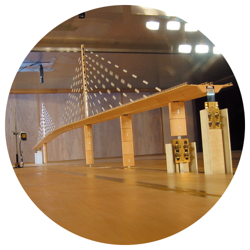 世界遺産に登録されているベトナムのハロン湾にかかる一面吊りPC斜張橋(しゃちょうきょう)※です。橋の長さ903m、橋を支える柱と柱の435mは、一面吊りのPC斜張橋(しゃちょうきょう)としては東南アジアで最長です。風に強く安全な橋にするために、実際の橋を忠実に再現した1/150スケールの模型を使って風洞実験が行われました。