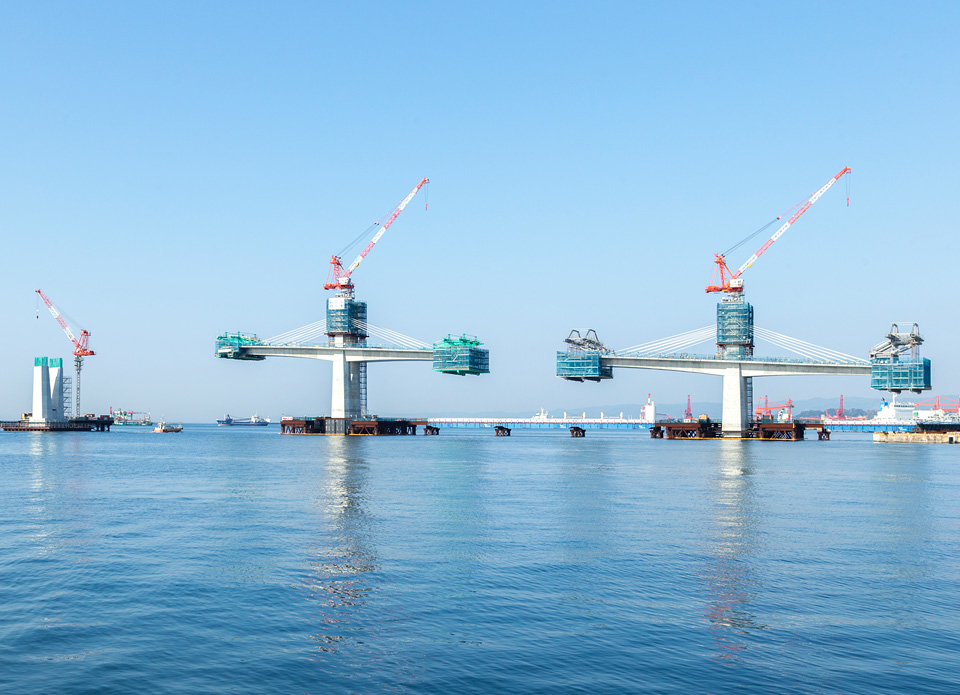 橋には、使われる素材や形によってさまざまなつくり方があります。写真は、主塔から斜めに張ったケーブルで吊っている構造の橋です。このような構造の橋では、移動作業車を使って、橋脚を中心に左右対称に橋桁(はしげた)をつくっていく「張り出し架設※工法」という方法が使われています。おもちゃの「やじろべえ」みたいですね。