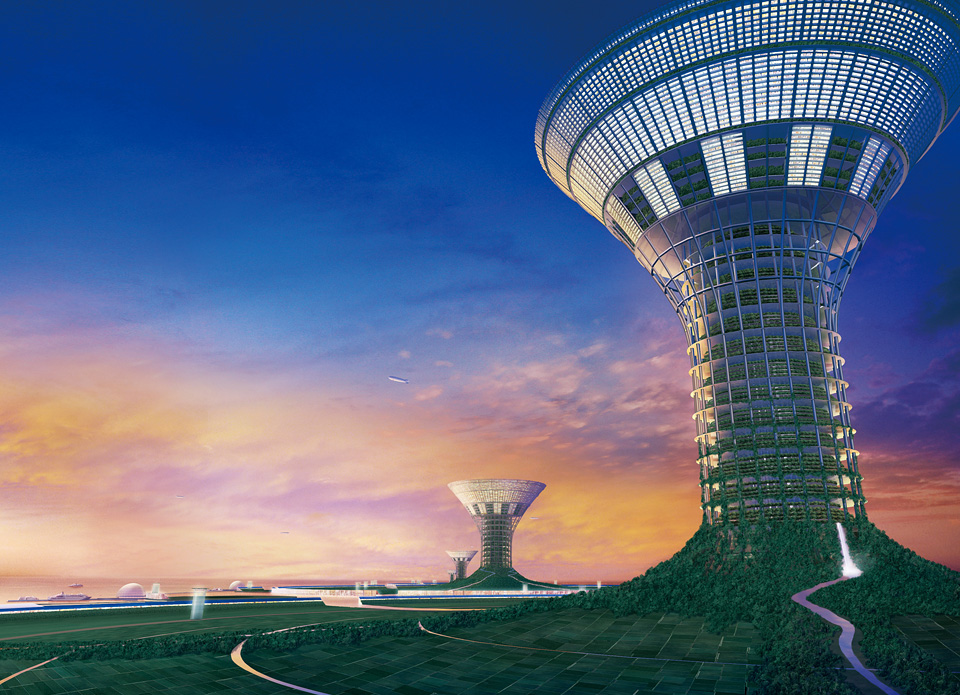 太平洋上の赤道直下に浮かぶ都市構想です。太陽の恵みが多く、台風の影響が少ないこの地域の特性を利用した完全自給自足の都市です。浮体式人工島の直径は3000m、高さは1000m。約5万人が暮らすことができます。環境に優しく暮らすことをコンセプトにしています。