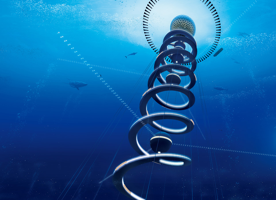 海上から深海までをスパイラル(らせん)状につなぐ深海都市です。深海には、食糧や海底資源などが豊富にあり、私たちが直面している、食糧や水、エネルギーや資源、CO2削減などの問題を解決する大きな可能性が秘められています。深海の持つ恵みを活用する都市を目指す構想です。