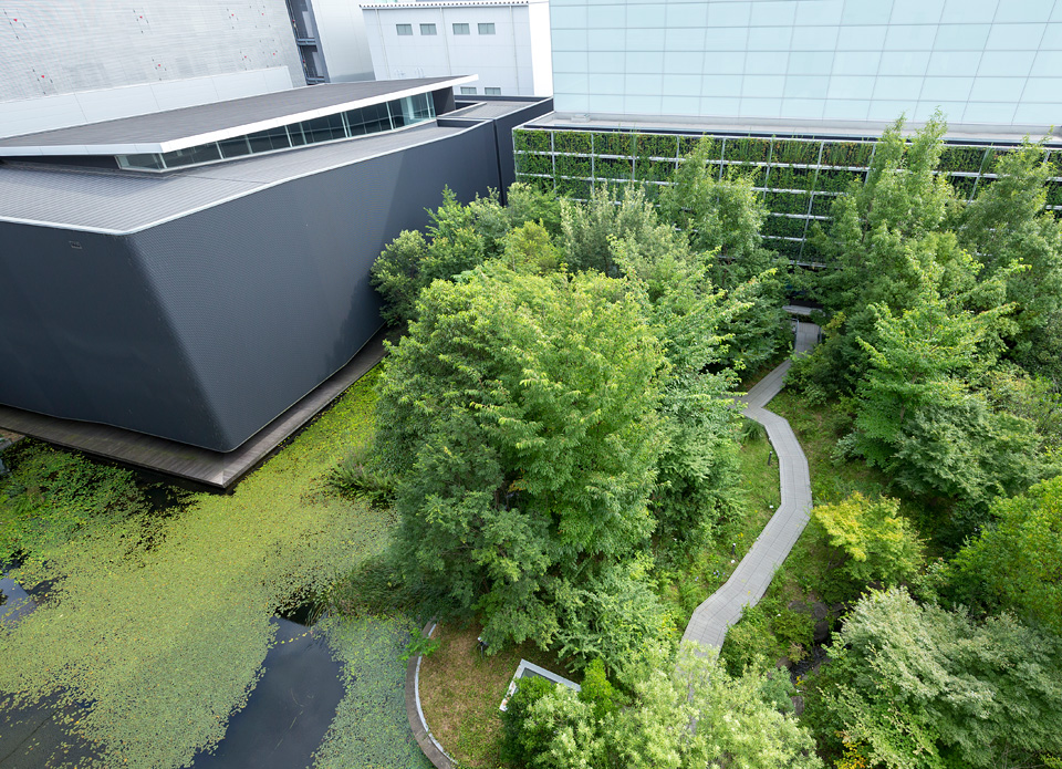 ビオトープとは、生物の生息空間のこと。自然が減少している都市部では、さまざまな野生生物が生息できる環境を再生しようという取り組みが進められています。技術研究所では、都市型ビオトープ「再生の杜(もり)」をつくり、植物や小動物などの生息状況を調べて緑化技術や環境保全に役立てています。