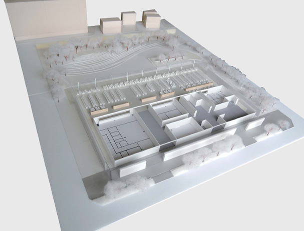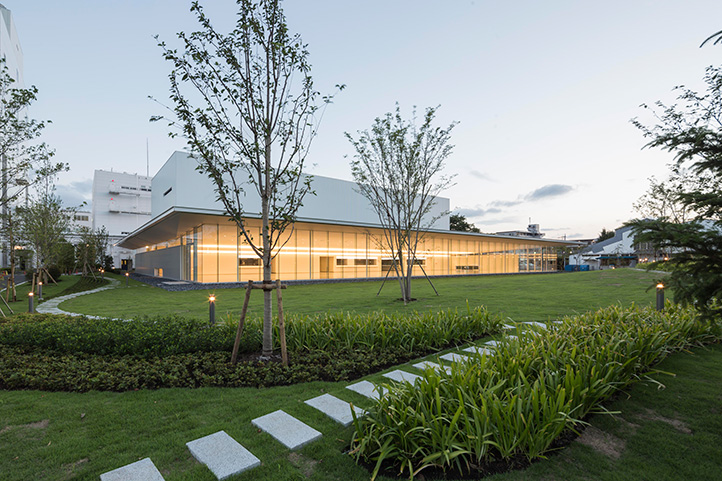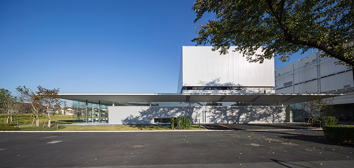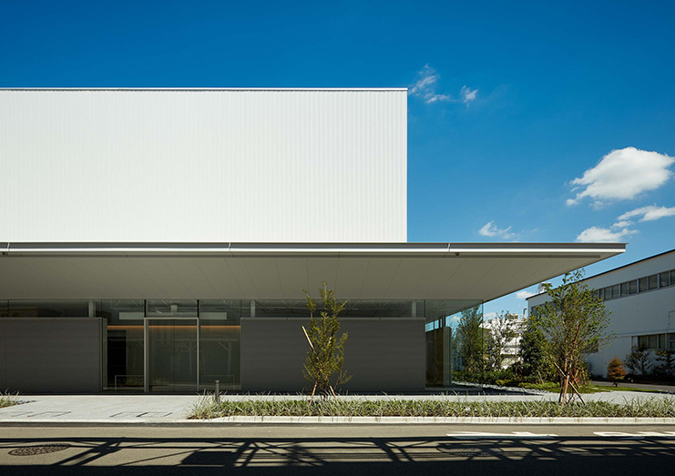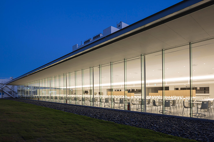 施主は企業スポーツにも力を入れ卓球チームを擁しており、食堂と卓球場の複合施設とすることが求められた。 1階の厨房の上に卓球場を配置した真四角のボリュームを立ち上げ、外部の緑地と一体となった喫食エリアを水平な屋根で区切ることで、統一感のある建物とした。