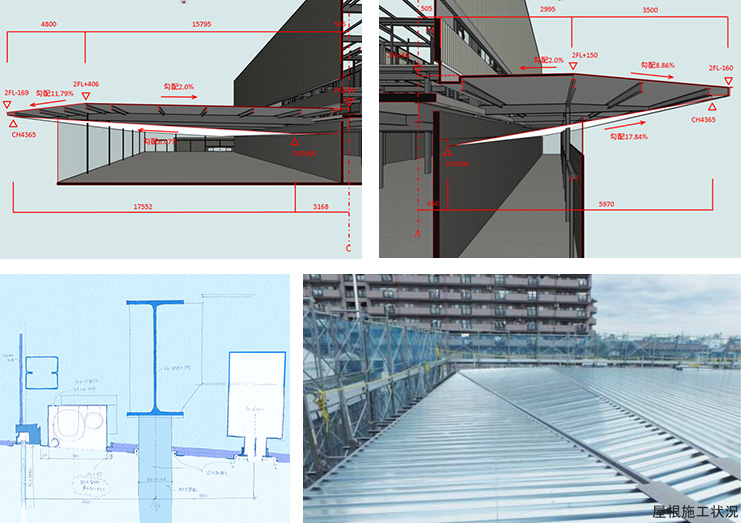 敷地のどの位置から見ても1枚の屋根に見えるよう、屋根勾配を検証した。各辺で異なる屋根勾配を、先端を一本の線として見せるために山と谷を組み合わせて実現した。3Dで検証し、下地鉄骨のレベルを複雑に変化させて実現しているが、その痕跡を感じさせない、シンプルな表現とした。