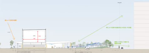 内外部をシームレスにつなぐために、全面ガラススクリーンとした。 構造的には、体育館のボリュームに地震力を負担させることで、屋根を支える柱を可能な限り細くすることが可能 になり、内外の一体感を高めることができた。