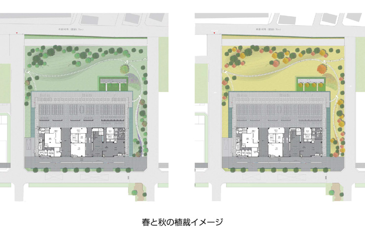 北側隣地は近隣の住宅街が広がっています。この住宅側に、バッファーゾーンとなる緑地を設け、その南側に食堂を配置 する計画としました。食堂の北側に緑地を設けることで、昼間はブラインドを閉める必要がなく、常に明るい日を浴びた グリーンを見ることができます。 食堂と緑地を一体でつくりこむことで、気持ちの良いリフレッシュ空間を目指しました。