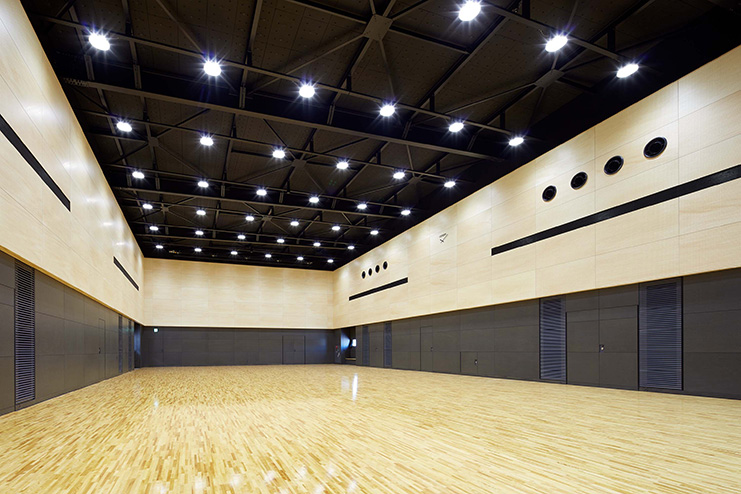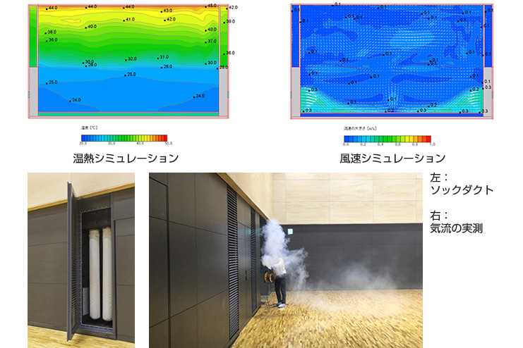 卓球の国際試合に求められる環境(照度1,000Lx、風速0.15m/S以下)を実現するため、空調はソックダ クトを使用した成層空調とした。シミュレーションで温度分布と気流を確認したうえ、施行後には風速を 実際に測定し、当初の性能が確保できていることを確認し、お引き渡しをしています。