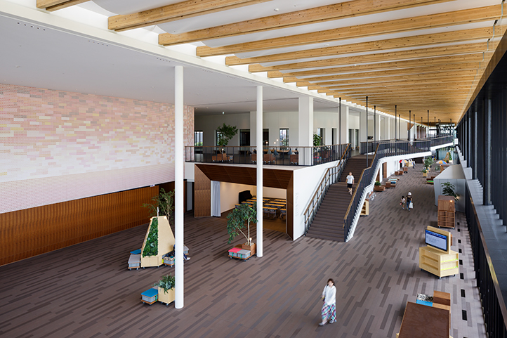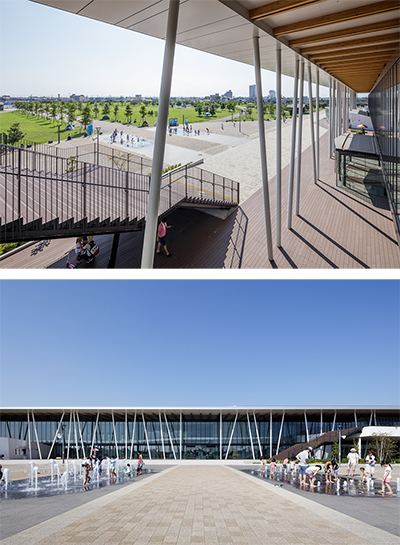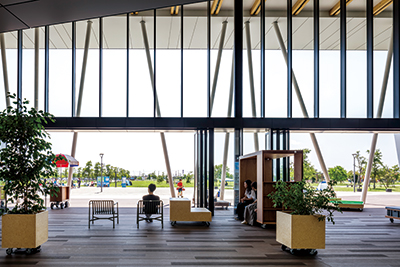 スポーツベット 着いたーーは、スポーツ施設と文化施設、各種交流機能をつなぐ170m×10mのワンルーム空間。通常時には施設を利用する人々のメインの動線となる。ひと目で見通せる空間は、災害時にわかりやすい避難施設となることも意図している。中間期には半外部空間として公園と一体的に利用することが出来る。